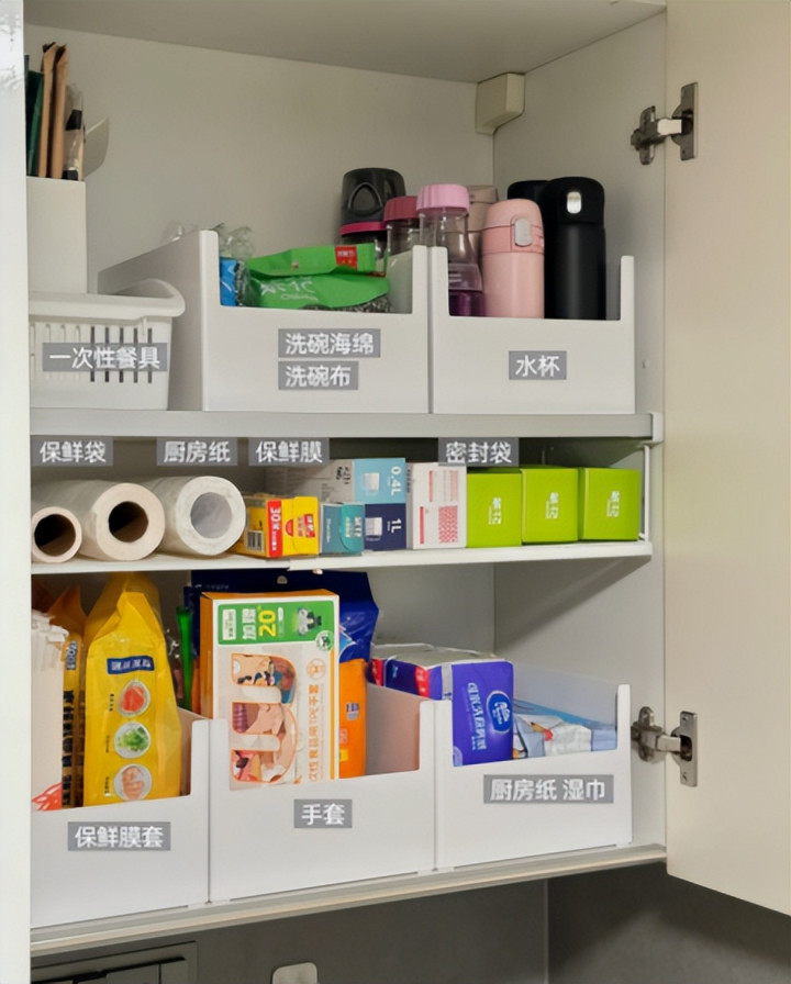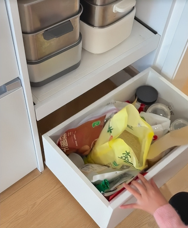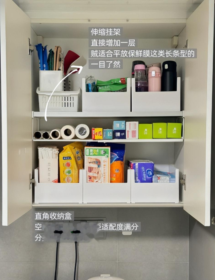 采用直角收纳盒,吊柜上层高,放不常用的囤货,收纳盒有高度不容易倾倒,下层放常用品,一眼就能找到,每次用完也能马上物归原处。