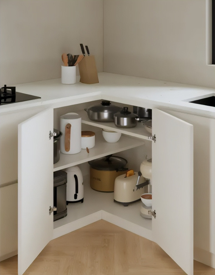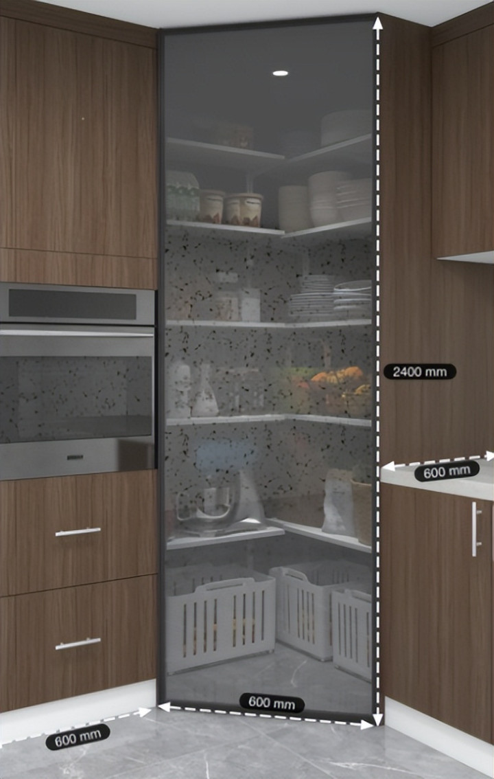 很多全屋定制会建议安装一个金属转角拉篮,可以解决这个问题,但是性价比不高,可以做成高低错层设计,储物更多,也能匹配各种高度的电器。