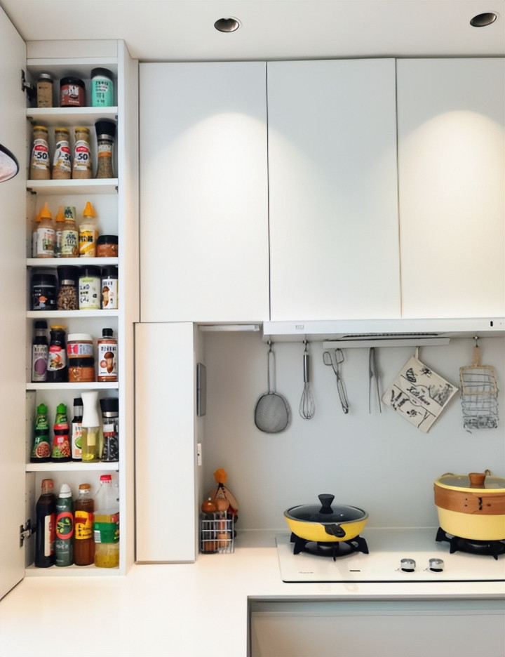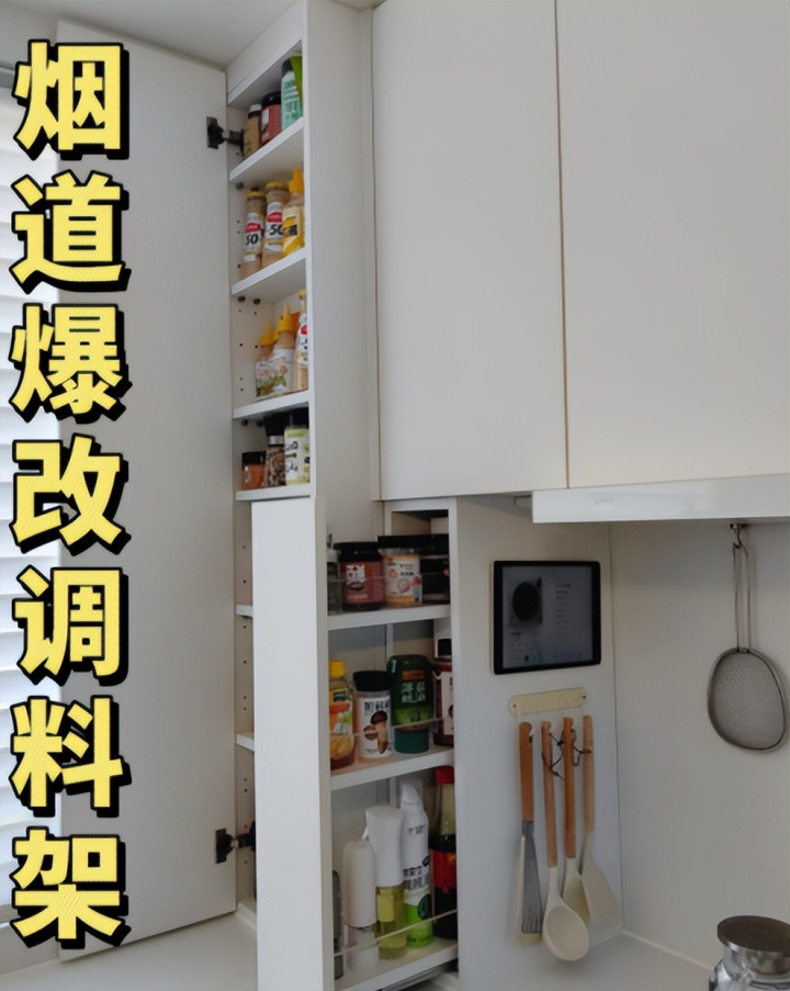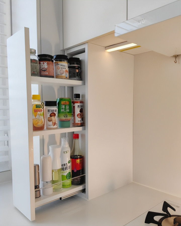 利用烟道的空间做了一组深度9cm宽度30cm的薄柜,虽然只有9cm深,但能放下家里所有的瓶瓶罐罐,还在旁边做一组抽拉式调料柜。