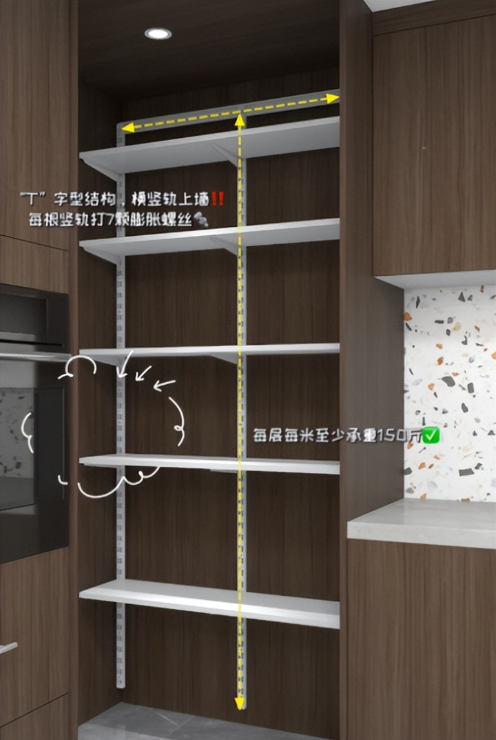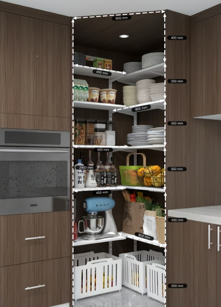 如果厨房足够大的情况下,不做传统直角柜,做成钻石型800库储藏室,效果绝对超出你的想象,内部金属架层板交错安装,层板可根据物品大小随意调节高低。