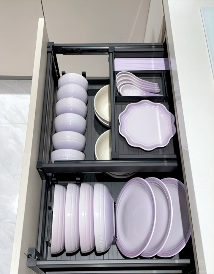 二层放碗,汤碗大的餐具,侧边放炒菜常用的盘子,碗碟架的分隔板都是可以调节的,能收纳各种不同尺寸形状的盘子,拿取很方便。