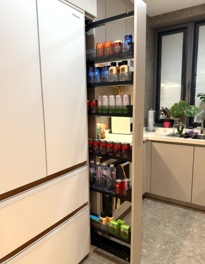 如果冰箱旁边尺寸过小,也就二三十公分,那就建议你装一个超薄拉篮,一来让整个空间更完整, 二来储存一些常温饮品零食,美观实用!