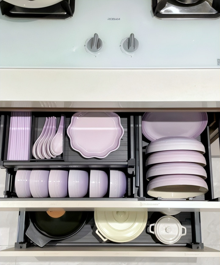 三层全抽空间大,用来放置锅具和其他小家电,整齐有序,神清气爽。