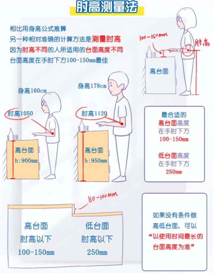每个人身材比例不同,不能用身高定台面高度,量手肘距离更精准。台面高度在手肘下方100—150mm为最佳。